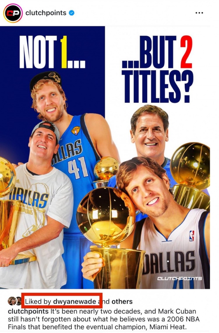 8月30日消息,美媒Clutchpoints近日通过社交媒体提及独行侠老板马克·库班此前的一则争议言论——他公开表示球队在2006年的NBA总冠军遭人“窃取”。值得关注的是,该贴文获得了当年总决赛MVP德维恩·韦德的点赞认可。